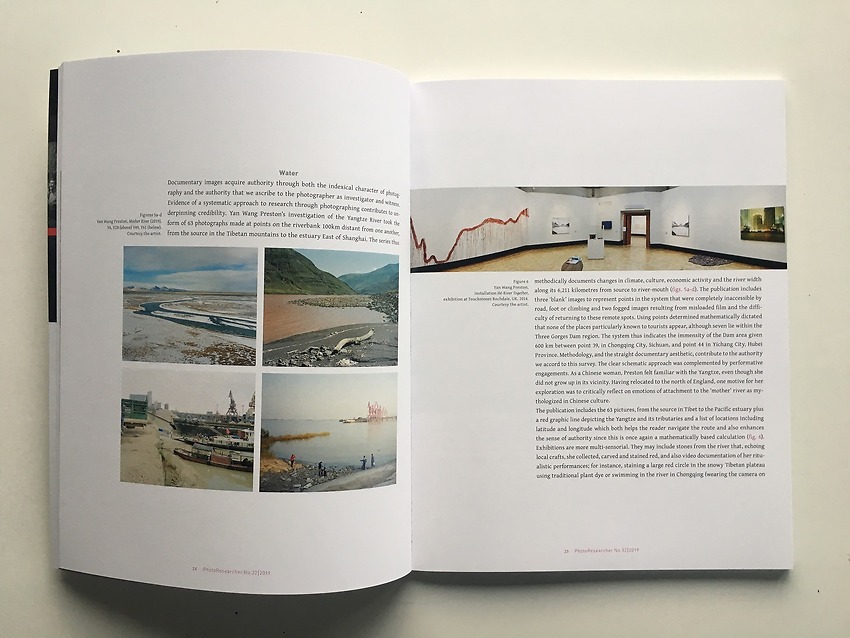 'Mother River' is featured in the freshly-published PhotoResearcher Journal (No 32-2019) with a special theme 'Poisoned Pictures'. In the journal, Professor Liz Wells' essay 'Critical Environments and Photographic Investigations' discusses 'Mother River' among other practitioners including Edward Burtynsky, Jem Southam, Richard Misrach, Christel Lebas, John Ganis, Andreas Muller-Pohle and Munem Wasif. She writes:'Documentary images acquire authority through both the indexical character of photography and the authority that we ascribe to the photographer as investigator and witness. Evidence of a systematic approach to research through photographing contributes to underpinning credibility. Yan Wang Preston's investigation of the Yangtze River took form of 63 photographs made at points on the riverbank 100km distant from one another, from the source in the Tibetan mountains to the estuary East of Shanghai. The series thus methodically documents changes in climate, culture, economic activity and the river width along its 6,211 kilometers from source to river mouth...' The whole essay and the Journal are fasinating to read.