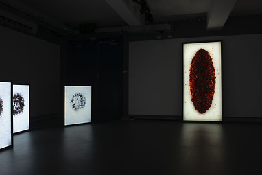 For Autumn – Leaves, Wang Preston collected all the red leaves produced by the plant during the whole autumn of 2020. Having touched them one by one, she laid them down on her studio floor before photographing them. The resulting work is a 6-metre hand scroll, produced to the highest quality by some of the best craftsmen in Shanghai. In the winter, she collected all the seed capsules from the same plant before setting them on fire, making a reference to the violent removal of the rhododendrons while celebrating the plant’s resilience. This piece, Winter – Seed Capsules, is presented as a set of 11 spectacular Duratrans lightboxes. In the winter, she then dissected all the 75 aborted flower buds from the same plant before photographing the aftermath of such a problematic method of scientific study. This piece, Winter – Bud Blast, has become an artist book and an audio-visual installation. Finally, when the spring and summer came, she collected all the flowers, again from the same plant, before sculpting them into the shape of a vulva. This piece, Spring Summer – Flowers, is produced as a double-layered tension fabric lightbox, glowing in the dark with all its femininity.