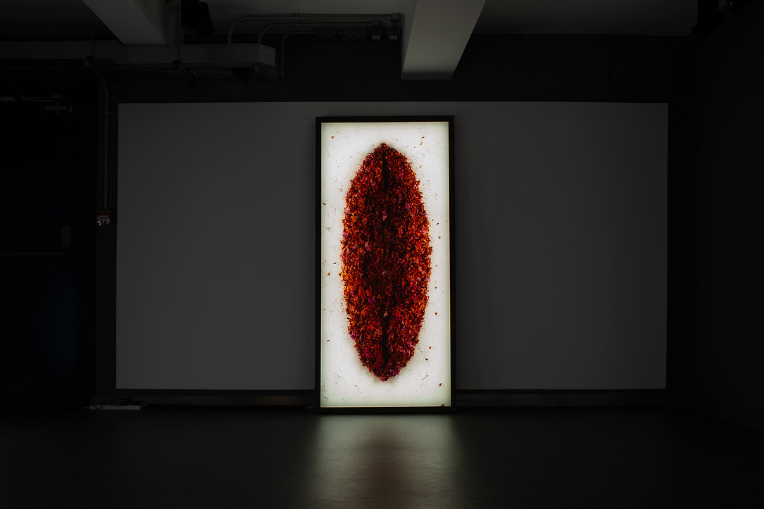 Spring Summer-Flowers is a photographic and sculptural piece celebrating the reproductivity of rhododendron flowers. The print itself represents ALL flowers collected from one rhododendron shrub during the spring and summer seasons of 2021. The flowers, in various degrees of decay, were then arranged to form a shape of a vulva.